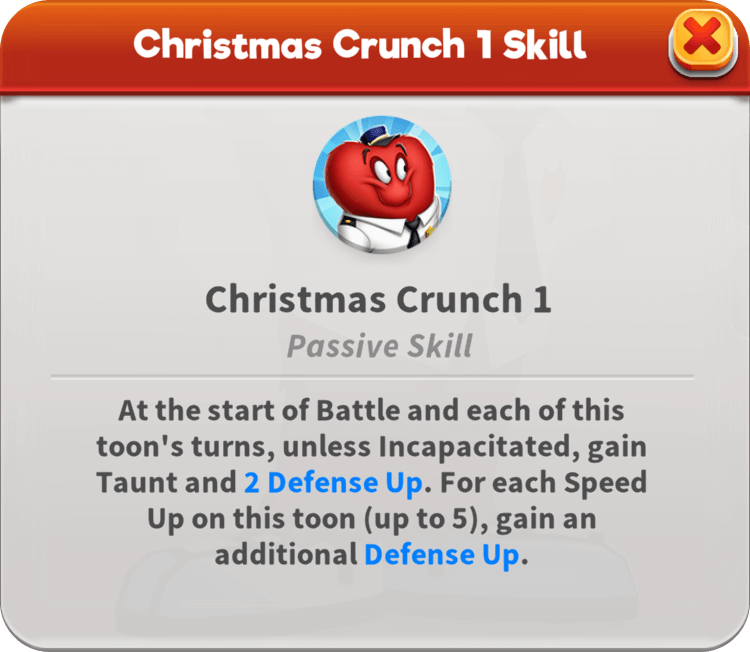 Security Guard Gossamer stays alert on the floor, bracing himself with extra Defense and Speed when the situation calls for it. He keeps an eye on the biggest threat in the aisle, removing Attack, Piercing, and Damage buffs from the strongest enemy Attacker before they can cause trouble. He also lowers enemy Attack and Speed while boosting his team’s Speed so they can stay ahead. The first two times any ally cracks under pressure, he removes Turn Meter from all enemies and inflicts Damage Down on the fastest enemy. Forget getting past this guard because all that Christmas Crunch has him working around the clock!