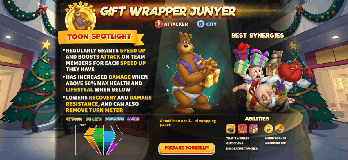 Meet Gift Wrapper Junyer, the City’s biggest, friendliest bundle of holiday hustle. He zips through battle handing out Speed Up and attack boosts like presents, hits harder when he’s healthy, and steals back what he needs when he’s not. With a knack for lowering enemy recovery, resistance, and even their turn meter, Junyer may be wrapped in tape, but he’s always ready to deliver.