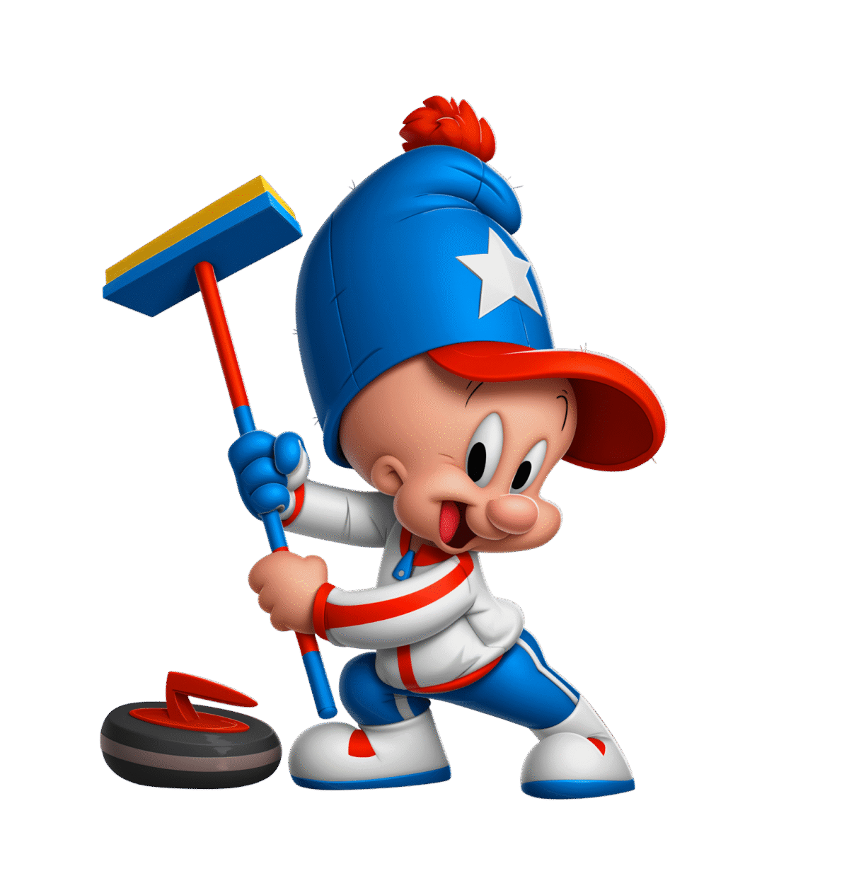 Curler Elmer is lining up for a clean sweep! This time, his target stays right where it is, a refreshing change from chasing a certain slippery wabbit.