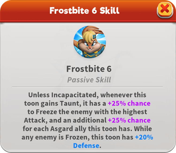 The fierce Skadi Lola steps forward, answering Asgard’s call to serve as guardian. Her arrows show no mercy as they relentlessly spread Chilly and weaken enemy Attack and Piercing. She regularly aims for the strongest Attacker, inflicting them with Chilly, and if that target lacks Freeze, she empowers the weakest ally with Damage Resistance. Her taunts come with a real danger of Frostbite.