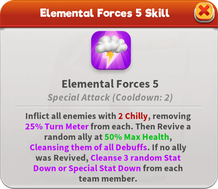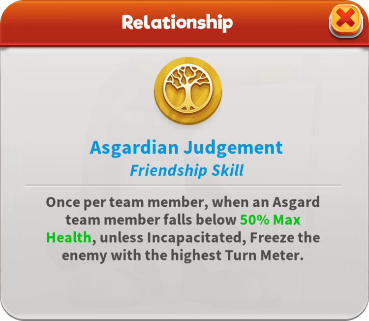 The all-mighty Odin Bugs watches over the Asgard team by Cleansing their Stat Downs whenever an enemy is inflicted with Chilly and restoring their Max Health whenever enemies Freeze. As the battle unfolds, he steadily inflicts Chilly while no foe is Frozen, shifting to Max Health damage once they are. If Thoro’s got his back, he’s even willing to sacrifice himself to significantly boost his team’s Turn Meter when Revived. According to legend, he manipulates Elemental Forces to Revive the fallen or steady those still standing!