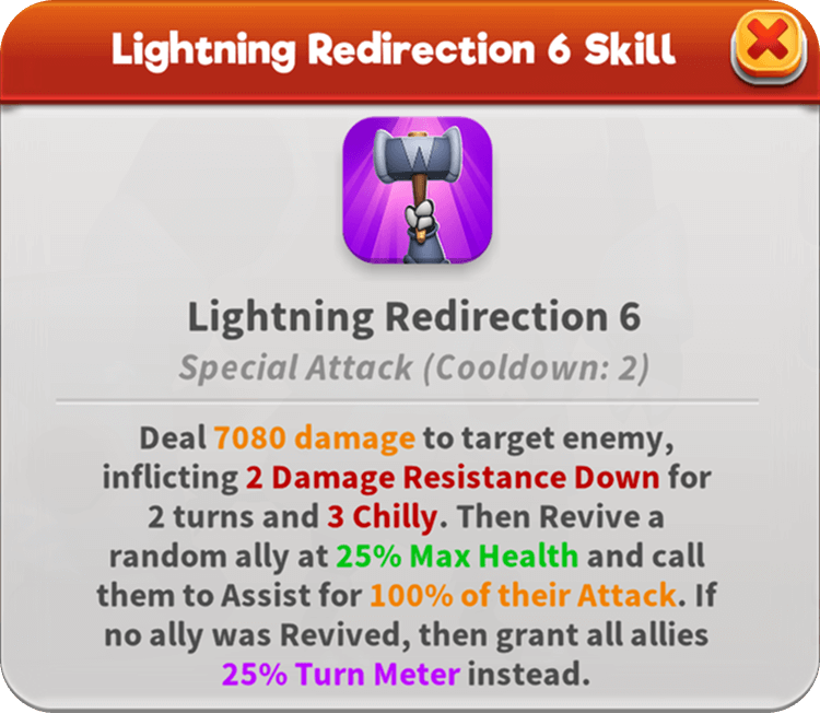 The skies rumble as Thoro thunders onto the battlefield. With this Attacker around, enemies take more damage and are more vulnerable to being Frozen. His hammer rains down fury as it inflicts Chilly and shatters enemy Defenses. When an enemy is inflicted with Freeze, he summons storm clouds to empower his team’s Attack. Should no foe be Frozen, the storm intensifies, driving all Attacker team members to deal greater damage. His Lightning Redirection has the power to bring fallen allies back into the fight to strike with all their might!