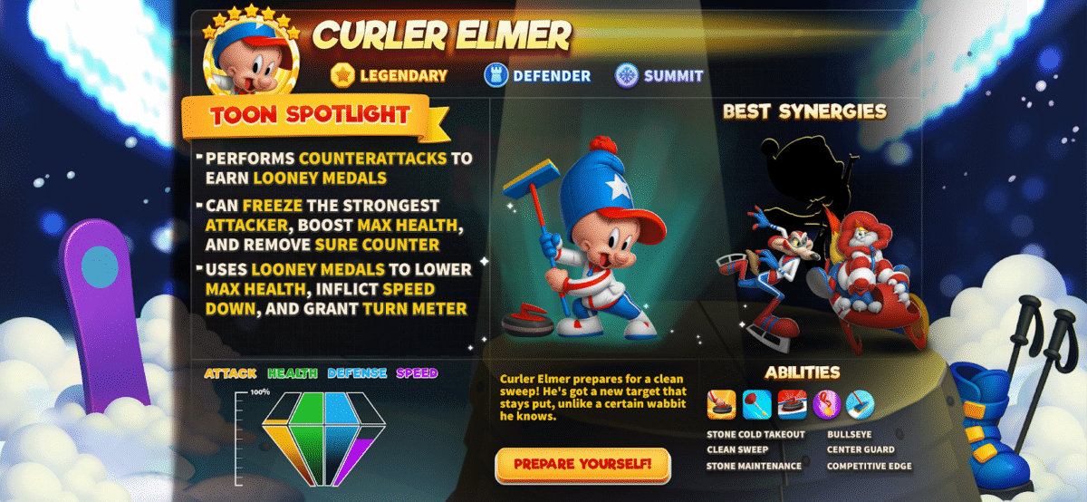 Armed with his trusty broom and a stone cold game plan, Curler Elmer performs clever counterattacks to earn shiny Looney Medals, then uses them to throw the match into a tailspin, lowering Max Health, slowing foes down, and giving his team the Turn Meter edge they need to glide to victory. He can freeze the biggest threat on the ice, boost his own Max Health, and even sweep away pesky Sure Counters like they’re nothing but fresh powder.