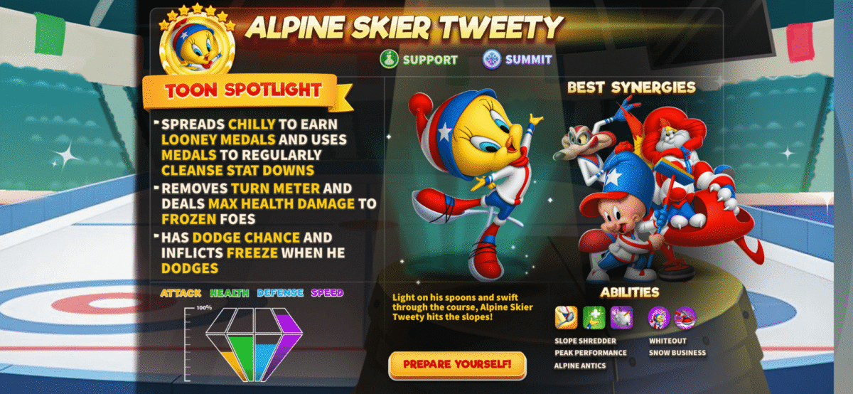 With a natural Dodge Chance and the ability to inflict Freeze when he dodges, Alpine Skier Tweety turns defense into a wintery counterattack. Swift, slippery, and surprisingly fierce, this Support toon is ready to glide straight into your Summit squad and leave the competition out in the cold.