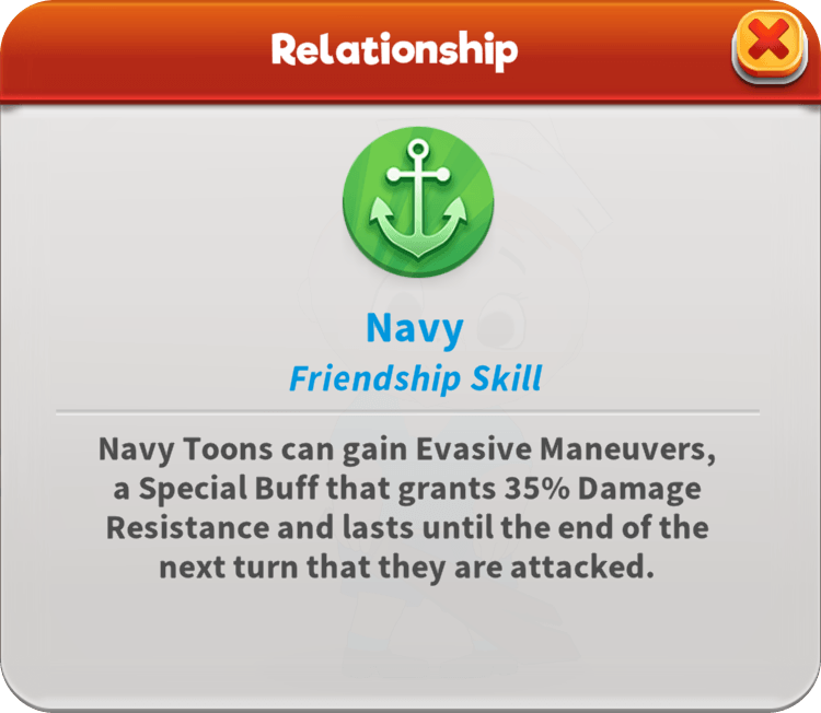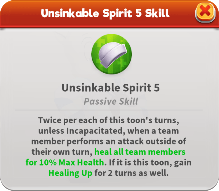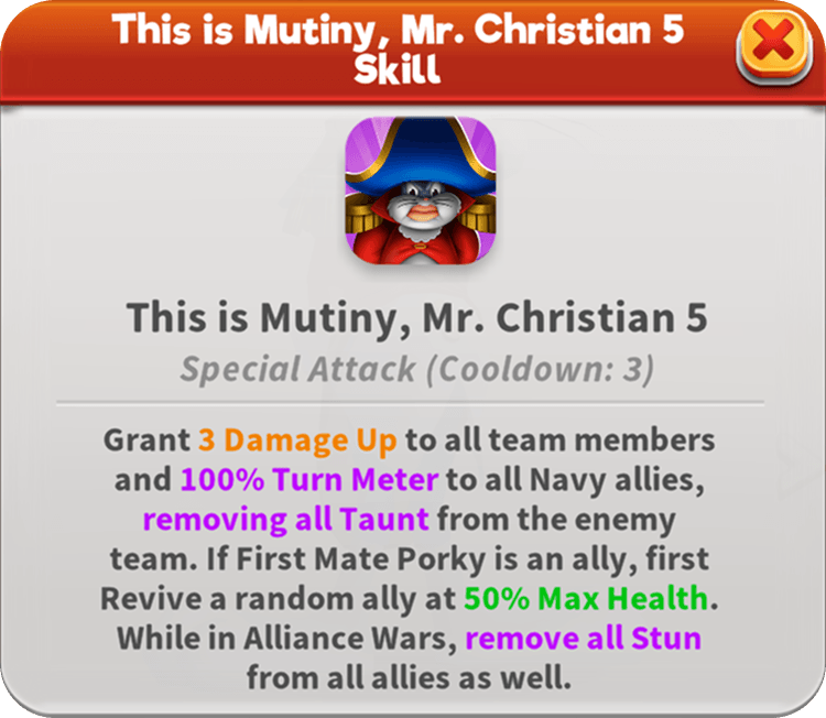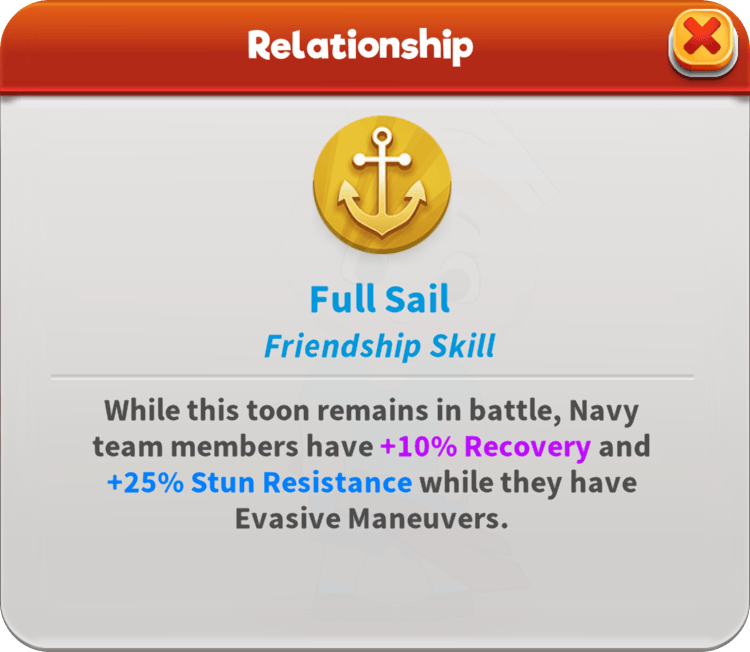 Captain Bligh runs a tight ship. As the Defender, he easily gains Evasive Maneuvers when he lacks it and also grants it to his team if he loses Taunt. He keeps all the sailors in line, calling random allies to Assist him while restoring their Max Health. His unshakable authority makes him immune to all Stat Downs and under his command, the crew holds steady with Defenders resisting Defense Down, Attackers resisting Attack Down, and Support toons resisting Speed Down. This captain’s call for mutiny empowers the whole team, and with the First Mate’s support, also revives the fallen.