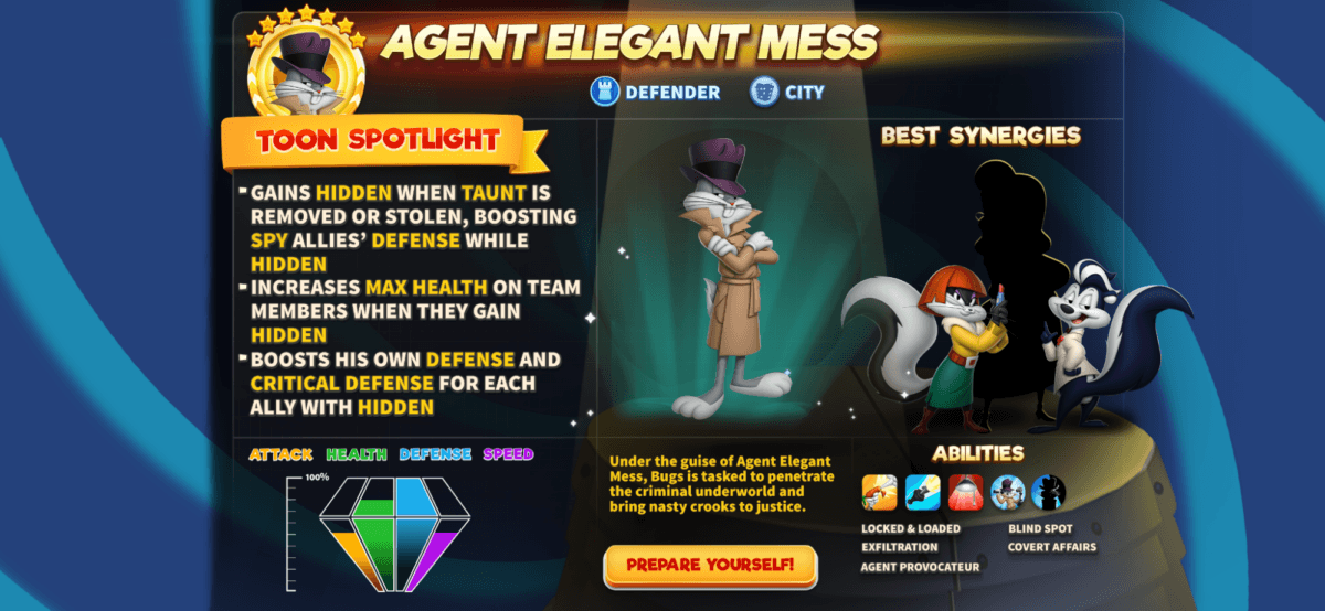 Meet Agent Elegant Mess, the smooth talking spy who’d rather vanish than fight fair. The moment Taunt disappears, so does he slipping into the shadows and boosting his fellow spies while Hidden.