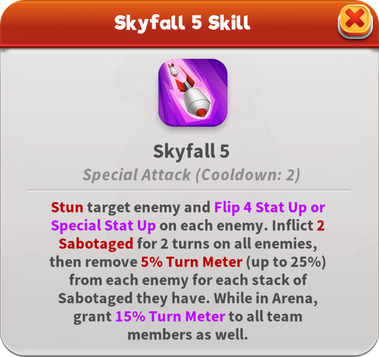 Super Spy Granny keeps the entire operation running smoothly, making sure her team can outlast any mission. She constantly supports her allies by healing them when they gain Hidden or damage Sabotaged enemies, granting Hidden to vulnerable allies, Flipping Attack Down or Damage Down when they gain Hidden, and Cleansing Damage Down or Damage Resistance Down from those already Hidden. This seasoned spy controls the pace of battle by using her special, Skyfall, to remove Turn Meter from all enemies.