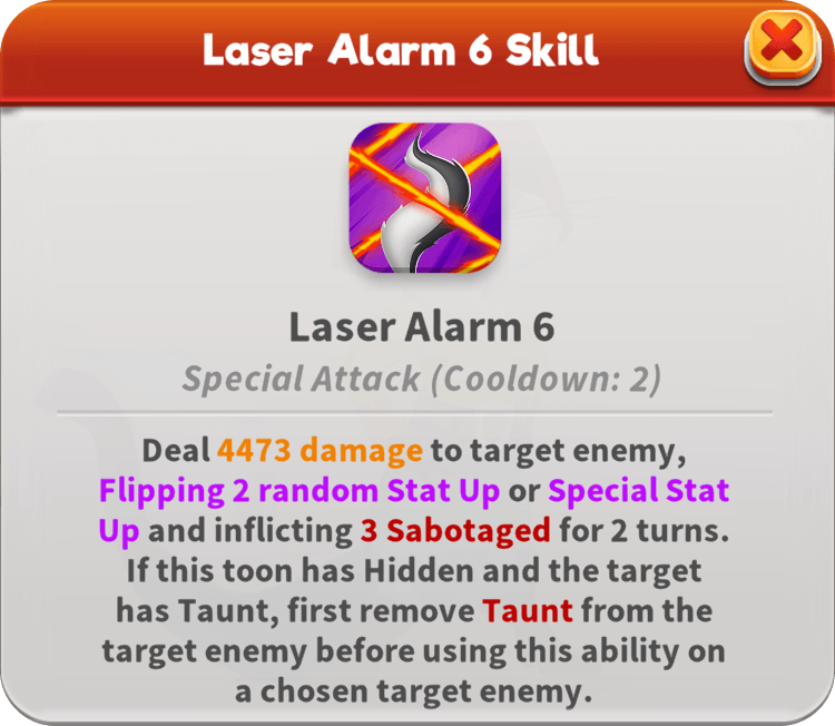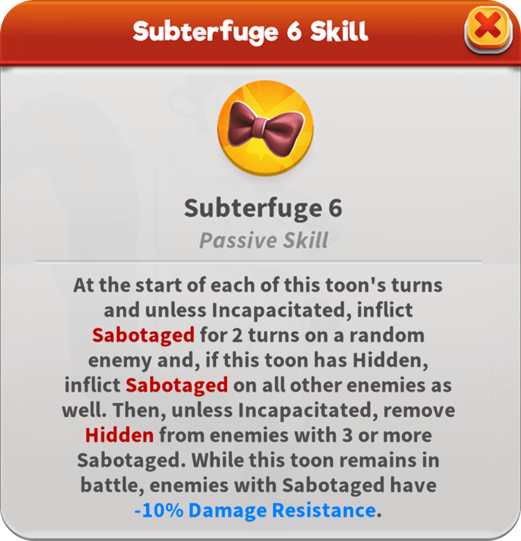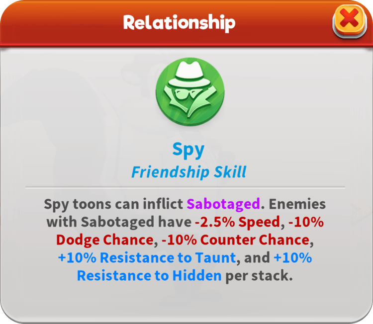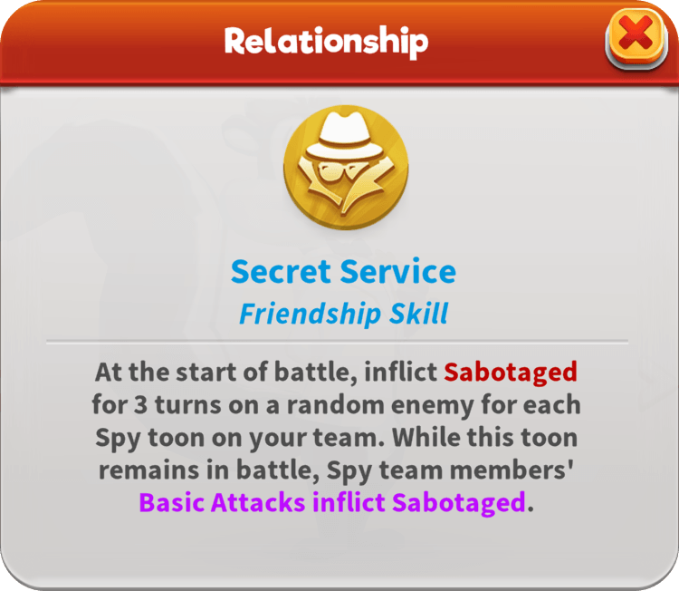 Using makeup products disguised as spy devices, Agent Penelope inflicts Sabotaged on foes who attack Taunting allies. She also Flips Stat Ups or Special Stat Ups on Sabotaged enemies and escalates matters with Damage Over Time for each Sabotaged. In battle, she enables all Hidden team members to strike with increased Piercing, gaining Hidden herself when any toon gains Taunt. Even when she accidentally sets off a Laser Alarm, she can still slip past the strongest defenses if Hidden.