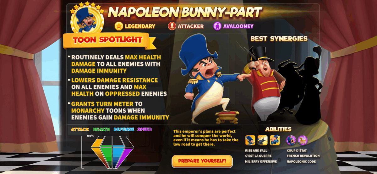 Meet Napoleon Bunny-Part, the pint-sized powerhouse with a voice as loud as his ambitions! This Legendary Avalooney Attacker marches into battle dealing devastating max health damage to enemies with Damage Immunity, shattering their defenses and boosting his Monarchy allies’ turn meter while he’s at it. Whether he’s lowering resistances or commanding the field with his tactical might, this emperor doesn’t just fight—he conquers.